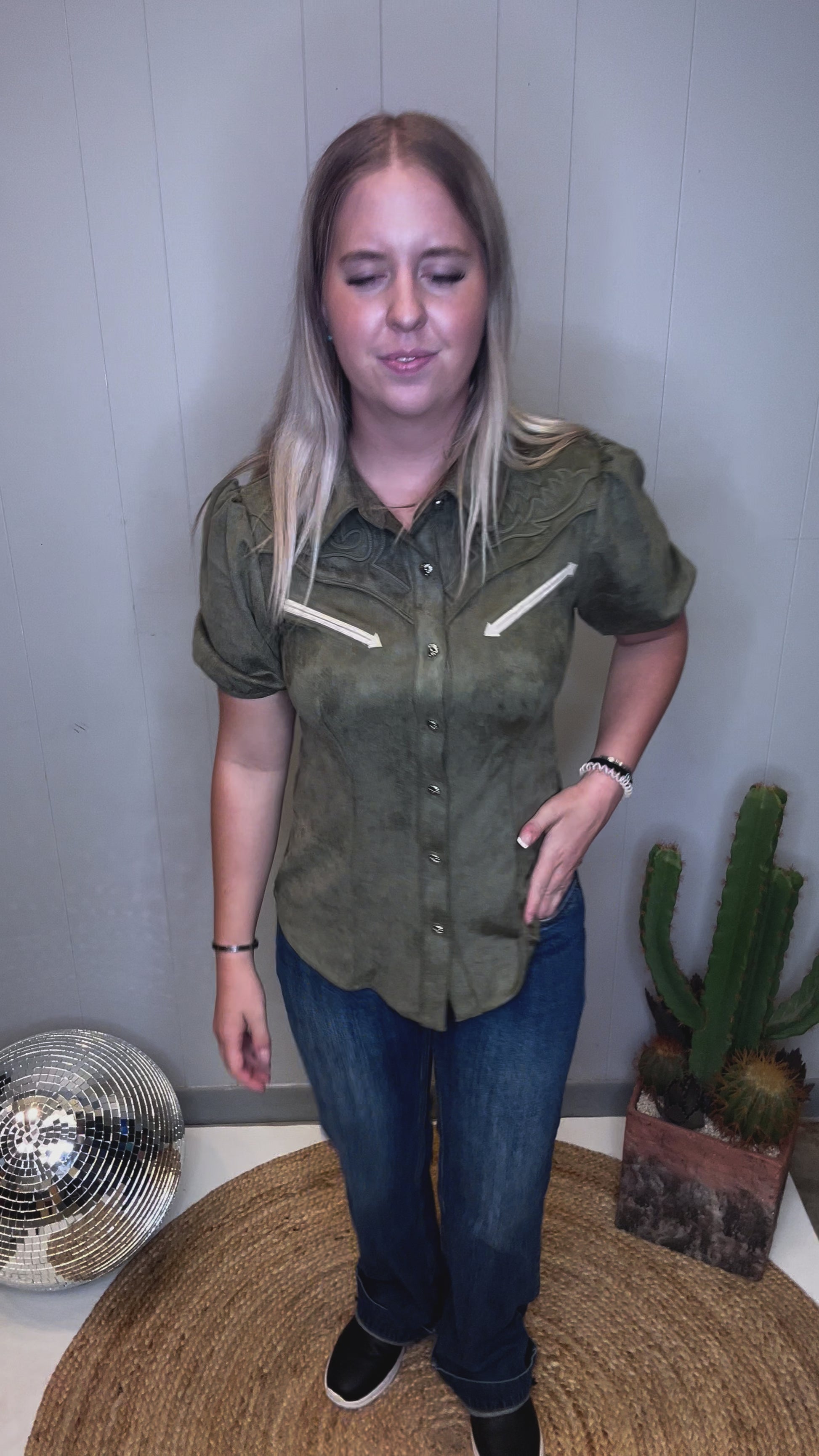 ¡Vuélvete occidental con Calaboose Top! En un moderno verde oliva, este top no solo es elegante sino también cómodo con su diseño con botones en forma de concho y mangas con volantes. Perfecto para cualquier ocasión, este top se convertirá rápidamente en un elemento básico de tu armario. Ajuste elástico fiel al tamaño.