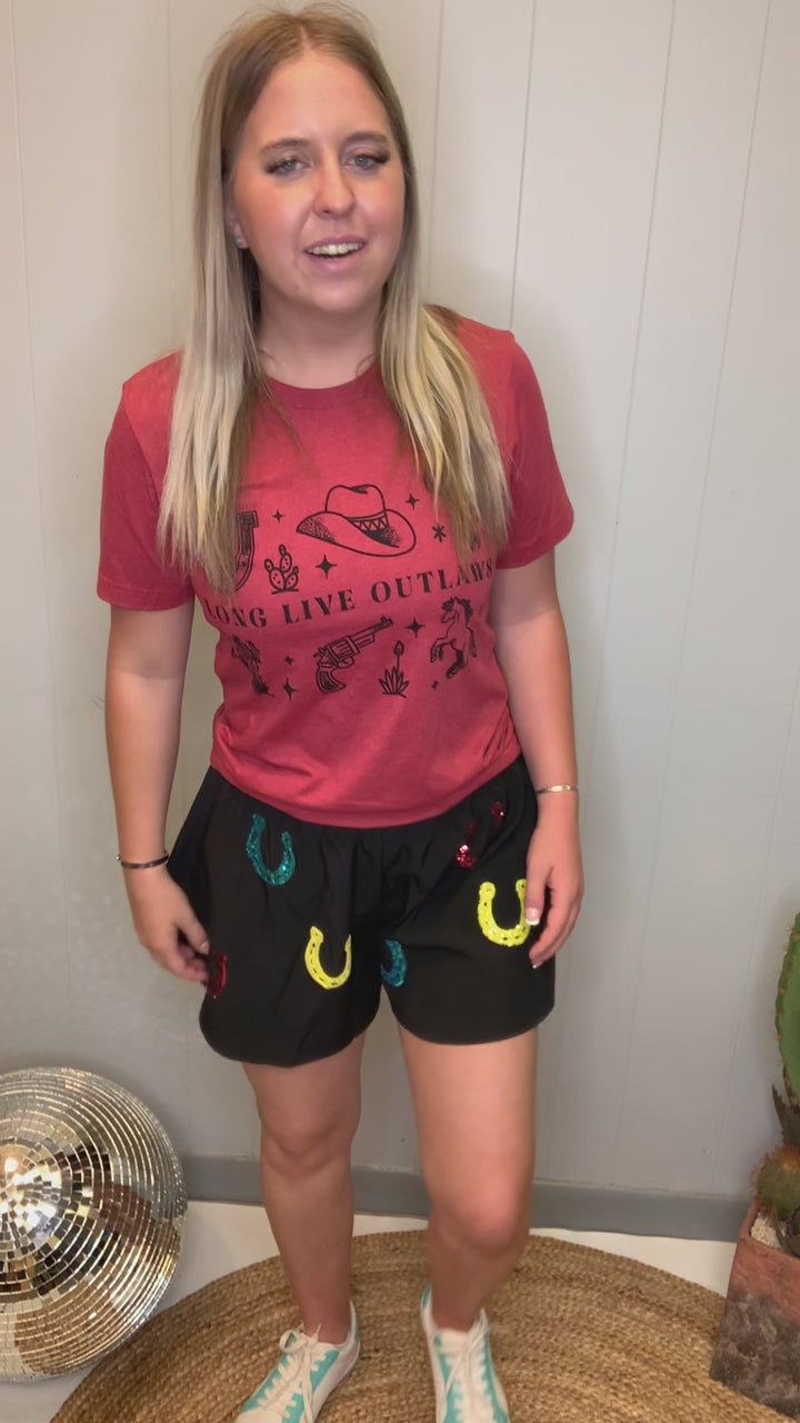 ¡Ponte los pantalones cortos Lucky Buck! Estos pantalones cortos están hechos con un cómodo y lindo diseño de herradura, y cuentan con vibrantes herraduras de lentejuelas amarillas, rojas y turquesas para darle un toque de suerte y estilo. Perfecto para cualquier ocasión. ¡Sea dueño de su suerte y estilo con estos pantalones cortos hoy! Ajuste elástico fiel al tamaño. Estos pantalones cortos son fáciles de cuidar y tienen pantalones cortos incorporados debajo.