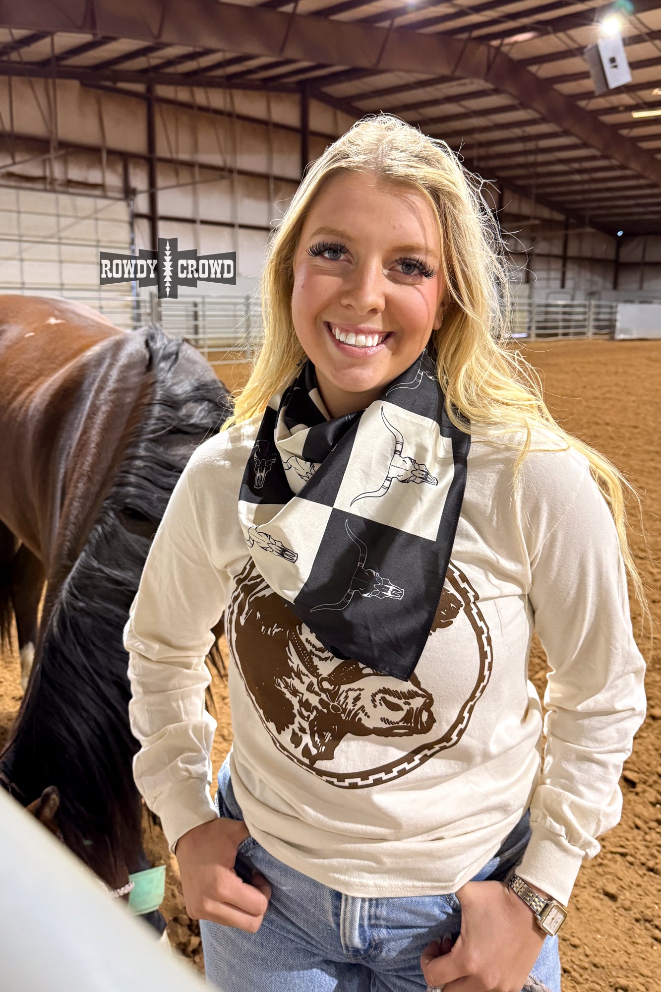 The BLACK Checkered Skull Wild Rag adds a clean, modern twist to classic western style. Featuring a bold black-and-cream checkered pattern covered in longhorn skull outlines, this silky wild rag is the perfect mix of punchy and polished. Soft, lightweight, and easy to tie, it elevates any outfit- from rodeo tees to dressy denim and turquoise.