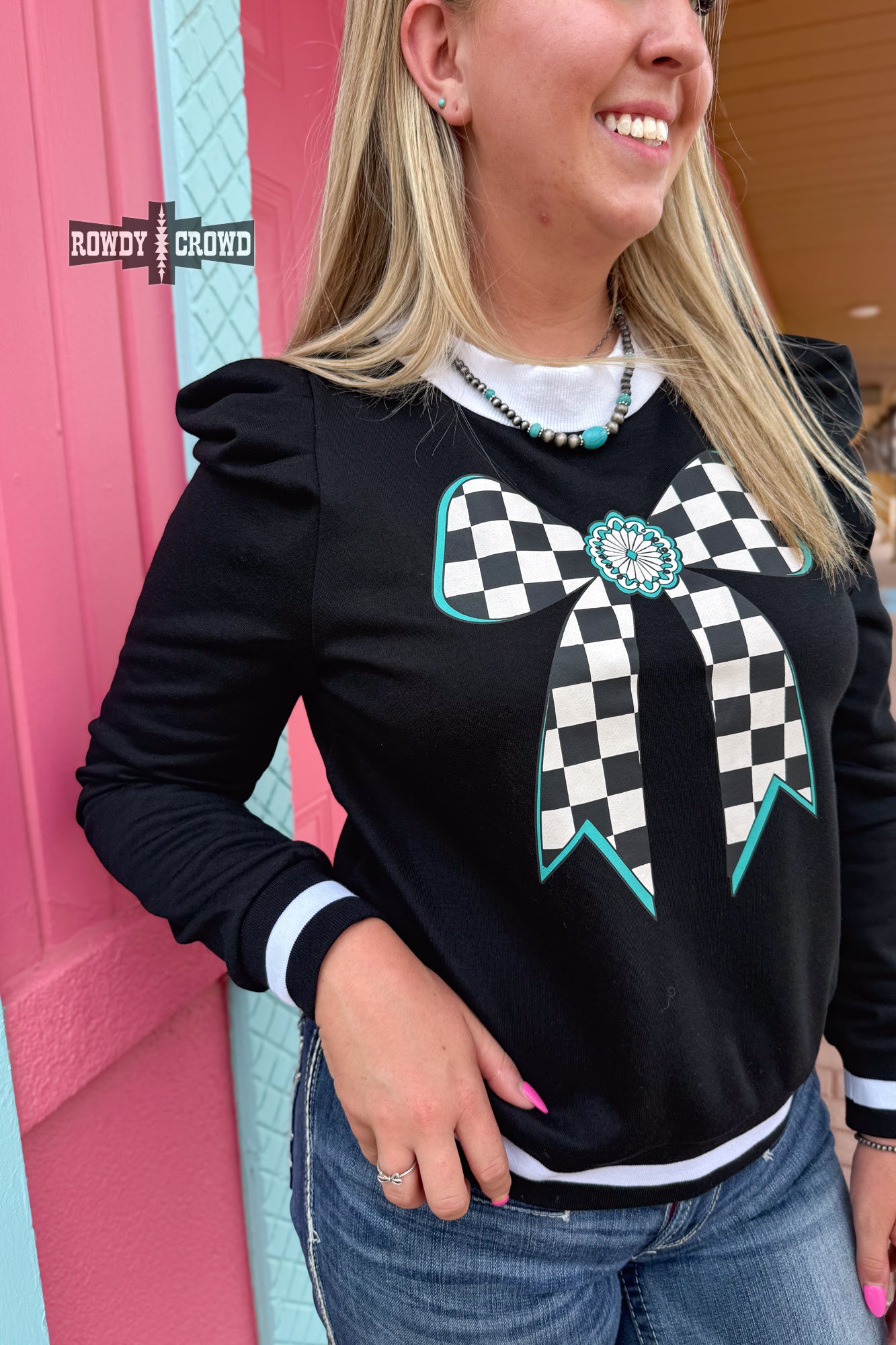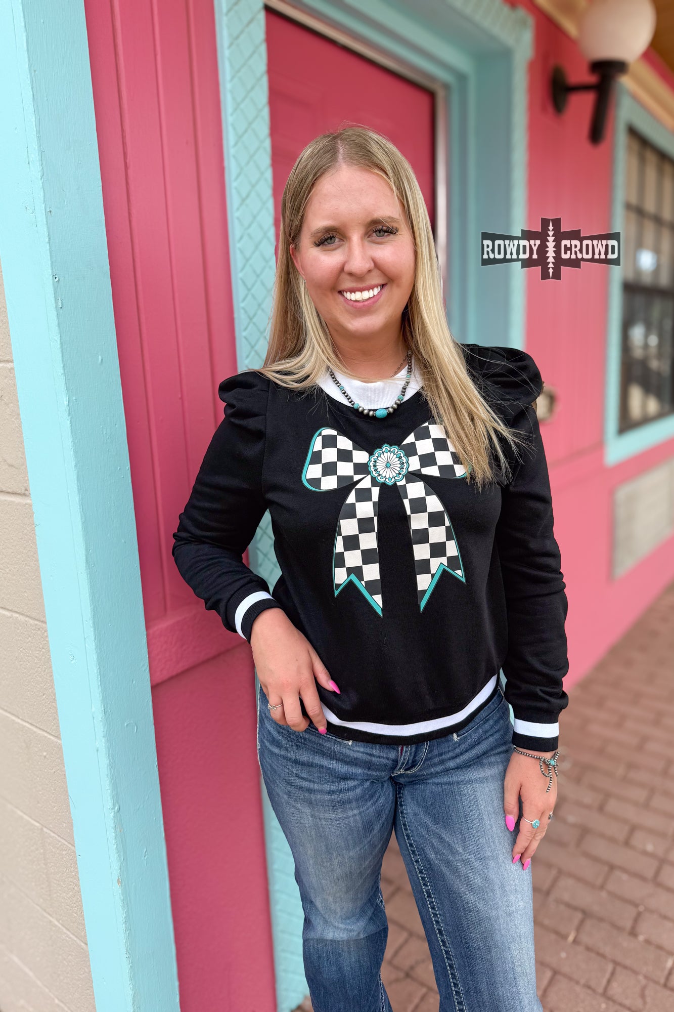Cute, bold, and a little bit retro—the Buffalo Bow Top is serving attitude! Featuring a big checkered bow graphic front and center, contrast trim, and playful puff sleeves, it’s your go-to for comfy with a statement. Pair it with jeans, boots, or a skirt and own your look from cozy days to cool nights.