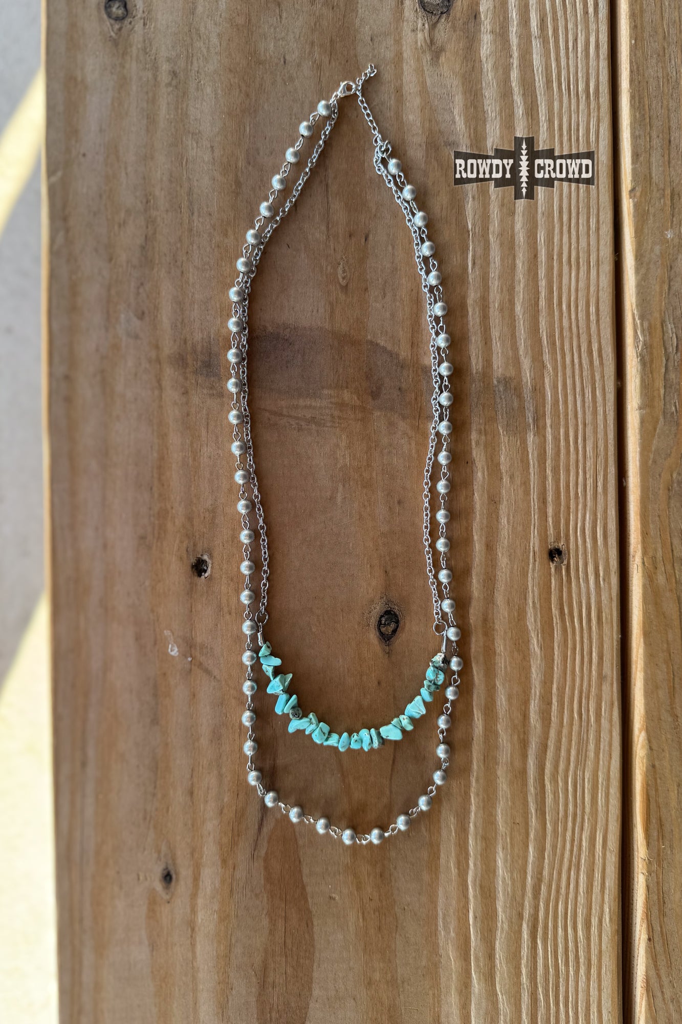 The Turquoise Pearl Necklace is the perfect blend of rustic charm and refined western style. Featuring a layered design with silver pearls, delicate chain links, and a row of genuine-looking turquoise chips, this necklace adds depth and color without feeling heavy. Wear it solo for a simple statement or stack it with your favorite chokers and squash blossoms for a full-on Rowdy look
